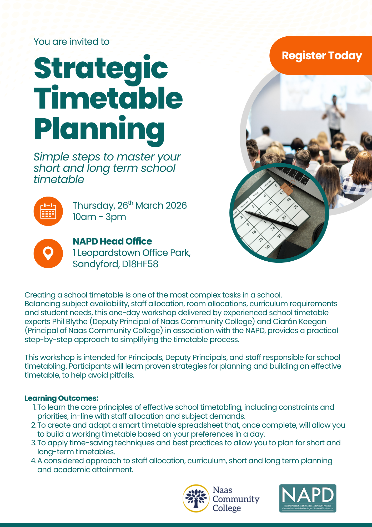 Balancing subject availability, staff allocation, room allocations, curriculum requirements and student needs, this one-day workshop delivered by experienced school timetable experts Phil Blythe (Deputy Principal of Naas Community College) and Ciarán Keegan (Principal of Naas Community College) in association with the NAPD, provides a practical step-by-step approach to simplifying the timetable process.